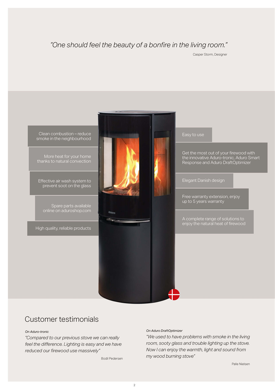 Aduro是集研發(fā)、制造和銷售與一體的丹麥火爐企業(yè),為丹麥當(dāng)代設(shè)計(jì)的典范。多年來(lái),Aduro一直專注于研發(fā)具有現(xiàn)代設(shè)計(jì)和先進(jìn)燃燒技術(shù)的火爐產(chǎn)品。對(duì)于產(chǎn)品品質(zhì),Aduro從未妥協(xié),且總能找出完美結(jié)合技術(shù)、終端消費(fèi)者審美以及良好操控性的方法。在歐洲,Aduro火爐的總銷量已超過(guò)40萬(wàn)臺(tái),現(xiàn)已成為歐洲最大的燃木火爐企業(yè)之一。