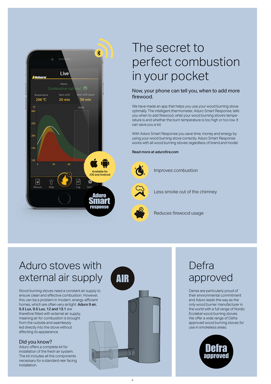這一環(huán)保認(rèn)證對(duì)產(chǎn)品顆粒物排放、效率和責(zé)任都有極高的要求。除了“北歐白天鵝”,Aduro的許多機(jī)型還擁有英國(guó)DEFRA認(rèn)證,可在英國(guó)及北愛(ài)爾蘭的無(wú)煙地區(qū)銷售和使用。因此,Aduro的產(chǎn)品不僅符合世界上最嚴(yán)苛、最高標(biāo)準(zhǔn)等級(jí)的環(huán)保要求,而且非常便于操作和使用。