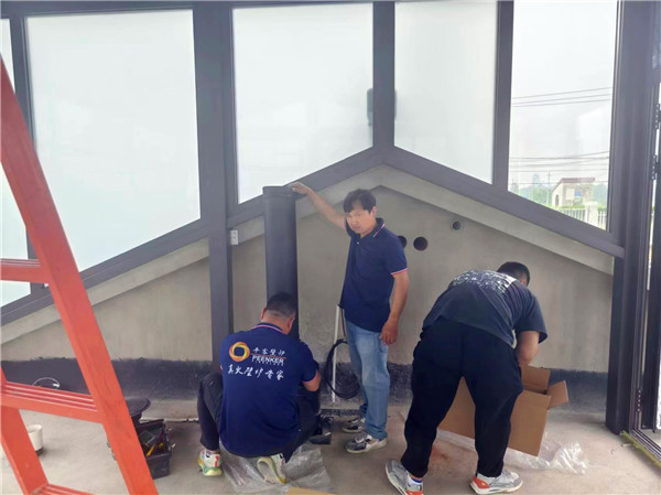 項(xiàng)目介紹:該項(xiàng)目位于南京八卦洲的獨(dú)立建筑,丹麥Morso 2140鑄鐵火爐安裝在建筑一樓,煙囪穿樓板,再穿陽(yáng)光房到達(dá)戶外,由【平客壁爐】項(xiàng)目部帶隊(duì)上門(mén)安裝。