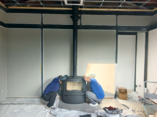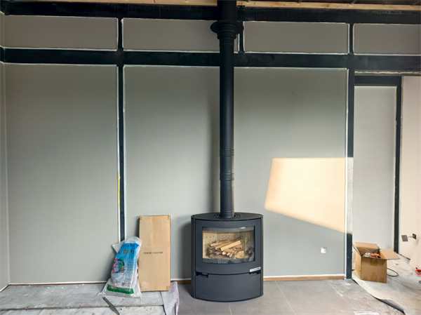 項目情況:2023年為本色美術(shù)館安裝了一臺丹麥Morso 6848鑄鐵火爐,今年,客戶復(fù)購了一臺丹麥Aduro A15寬屏火爐。今天由【平客壁爐】項目部帶隊上門安裝,壁爐安裝在頂樓,煙囪穿斜頂側(cè)墻出戶外。