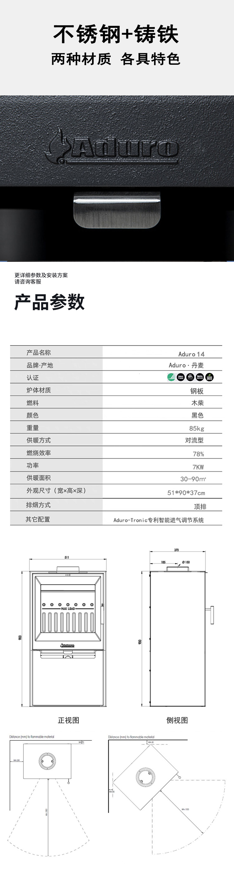 | 產(chǎn)品亮點(diǎn): | 官方售價(jià):19800;峰值功率7KW,供暖面積30-90㎡,效率78%,尺寸51*90*37cm。Aduro 14 是一款強(qiáng)大且高效的取暖設(shè)備,符合北歐白天鵝環(huán)保認(rèn)證、Ecodesign 2022排放認(rèn)證。立體式的設(shè)計(jì)將不銹鋼和鑄鐵結(jié)合,不銹鋼的現(xiàn)代感與鑄鐵材質(zhì)的質(zhì)樸形成鮮明對比,簡約而又經(jīng)典。 |