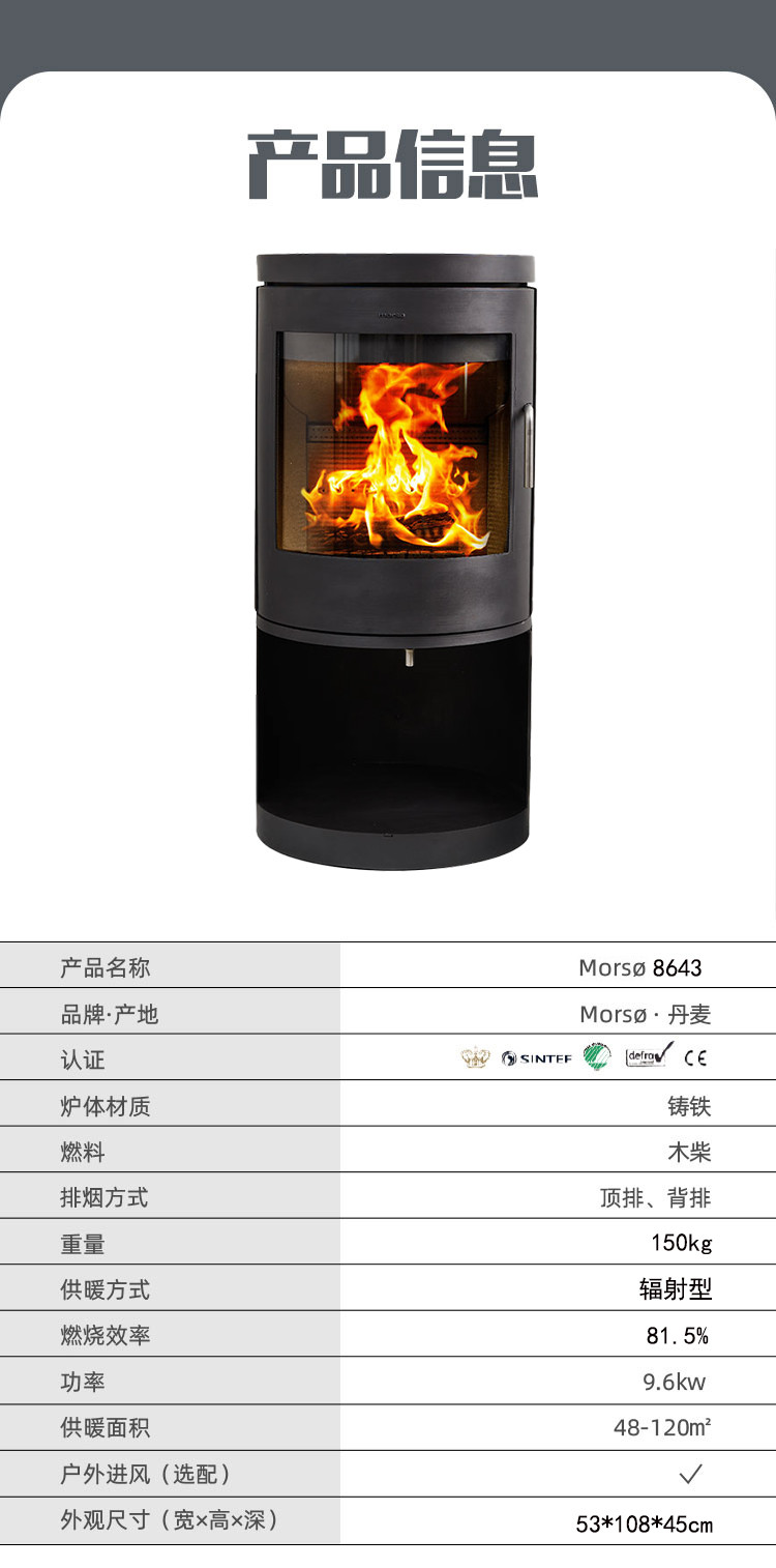 | 產(chǎn)品亮點: | 官方售價:¥69800,峰值功率9.6KW,效率81.5%,外觀尺寸53*108*45cm,供暖面積48-120平方。Morso 8643采用全新的內(nèi)部設(shè)計,結(jié)合6100和8100系列超高溫燃燒技術(shù),使得它成為全球“最強大”的燃木火爐之一。干凈簡約的設(shè)計風(fēng)格,看似簡單卻不失經(jīng)典,這可以讓您在使用幾十年后依舊不會過時,可選配戶外進風(fēng),頂排/背排兩種安裝方式! |